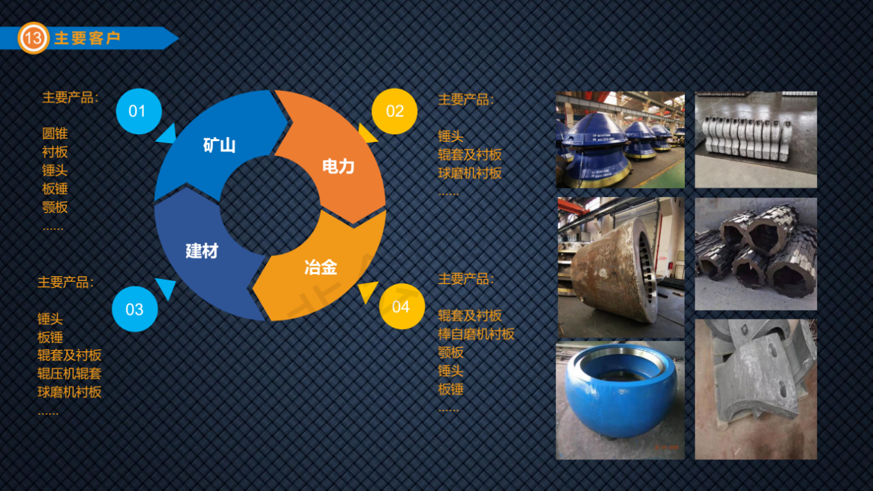 其中,铸钢(合金钢)为公司铸造事业部与原分公司(郁南县中兴耐磨材料有限公司)在2023年出进行优化重组,充分结合双方优势,即技术创新与成熟管理相结合,针对共同的客户终端,减少营销成本,也让客户得到一站式售后服务的便利。主要产品涉及电力、矿山、水泥、港口、航道疏浚所需金属耐磨易损件,产品材质有金属基陶瓷复合材料、高铬、高锰、合金钢等。